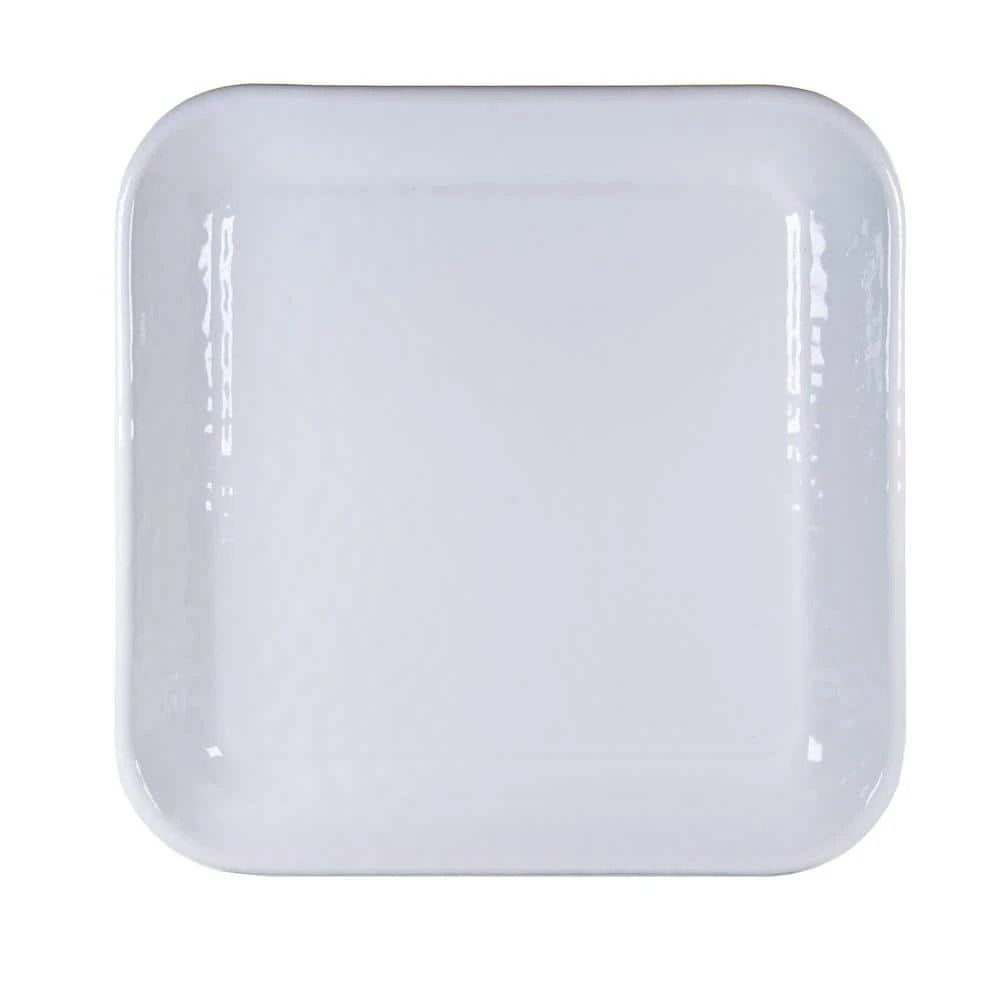 10.5 in. square trays (Set of 2). This enamelware is made of carbon steel coated with a porcelain enamel and trimmed in stainless steel. There will be variations in the shading of colors and pattern formations which are the results of the hand-dipped process.