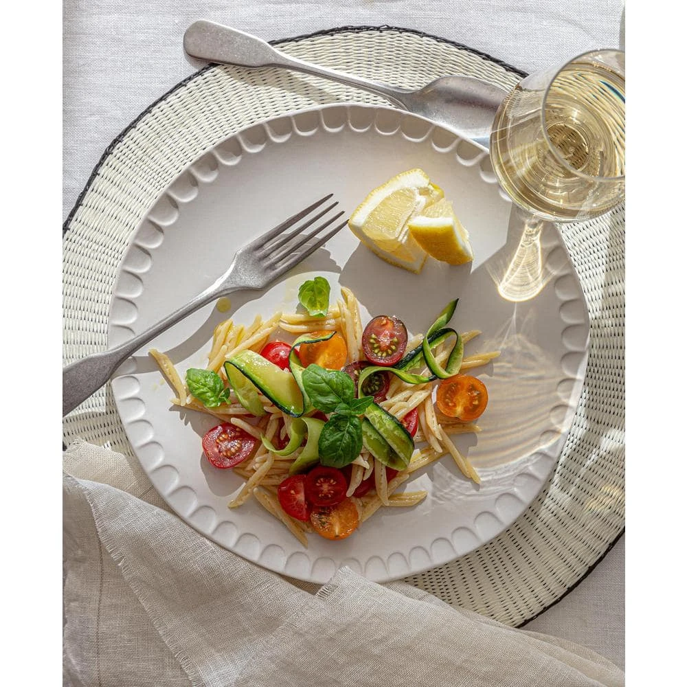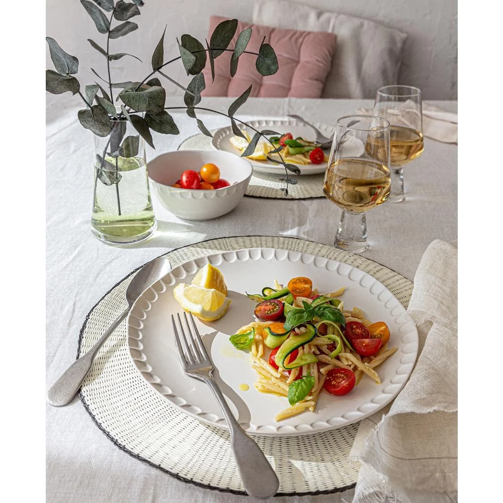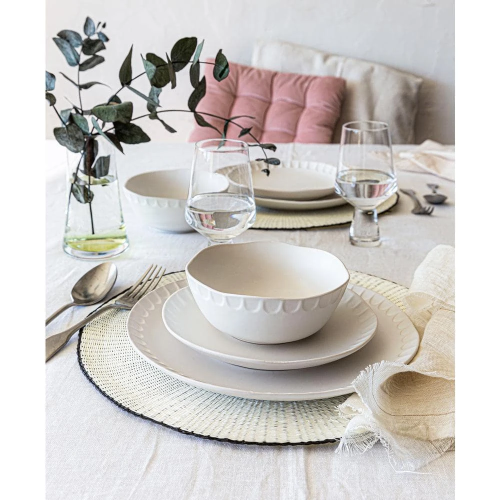 Thumbprint shaped impressions adorn the edge of this dinnerware set giving it a look and feel of a hand-made artisanal pottery. This dinnerware set includes 4-dinner plates (10.94 in. x 10.94 in. x 1.30 in.), 4 salad plates (8 in. x 8 in. x 1.1 in.) and 4 cereal bowls (6.10 in. x 6.10 in. x 2.52 in.). Service for 4. Dishwasher and Microwave safe.
