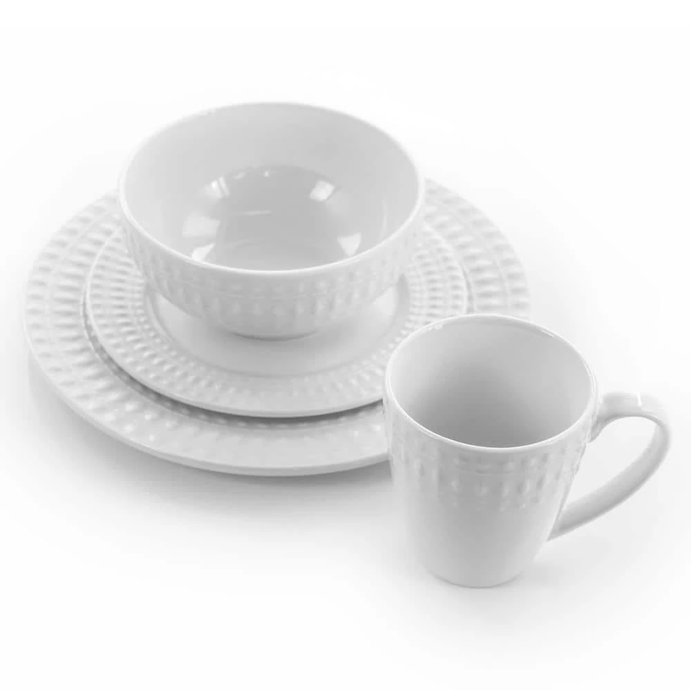 Add a touch of elegance to your home with the Elama Cara 16 -piece Dinnerware Set in White. This dinnerware set features an embossed circular pattern design on outer edges of each individual -piece to tie this set together. The set comes with four mugs, four bowls, four salad plates, and four dinner plates that make a complete set for four people. Each dish is made with high quality porcelain and is dishwasher and microwave safe for long lasting durability.