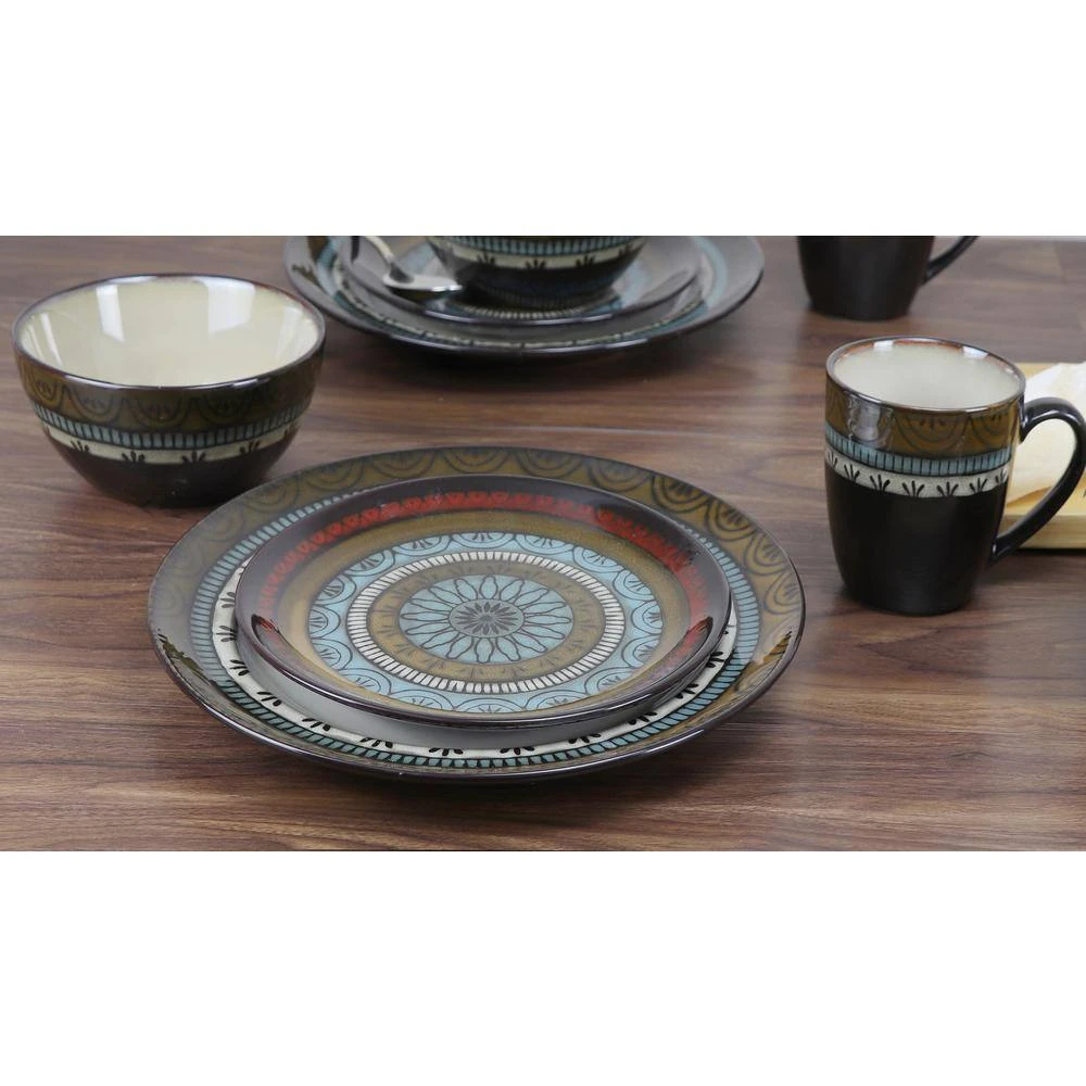 Artful design with earth tone colors and mosaic touches make this mix and match dinnerware set a winner. Soft colors are blended seamlessly to create an eye pleasing palette. Durable and always reliable this stoneware dinnerware is set to impress. Glazed coating protects and extends the durability. Service for 4 includes: 4-11 in. dinner plates, 4-6 in. Bowls, 4-8.5 in. salad plates, and 4-12 oz. mugs. Dishwasher and microwave safe.