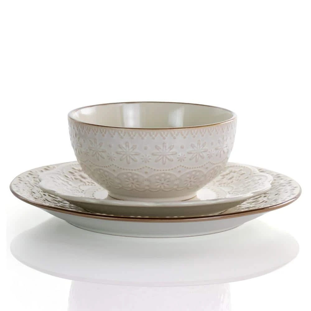Add a touch of elegance to your dinner table with the Elama Contessa 16 -piece Embossed Scalloped Stoneware Dinnerware Set in Ivory. Every dish in this collection is crafted from quality stoneware, decorated with embossed designed and scalloped edges on salad plate, and finished in a glossed glaze. Ideal for everyday and special occasion use. This tableware collection comes with a full service for four and is both dishwasher and microwave safe for easy cleaning and quick reheating.