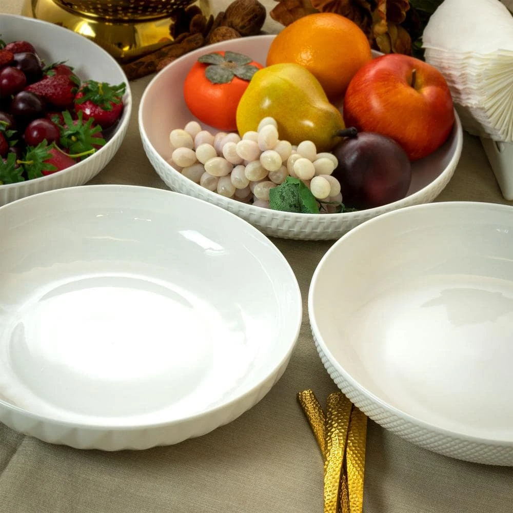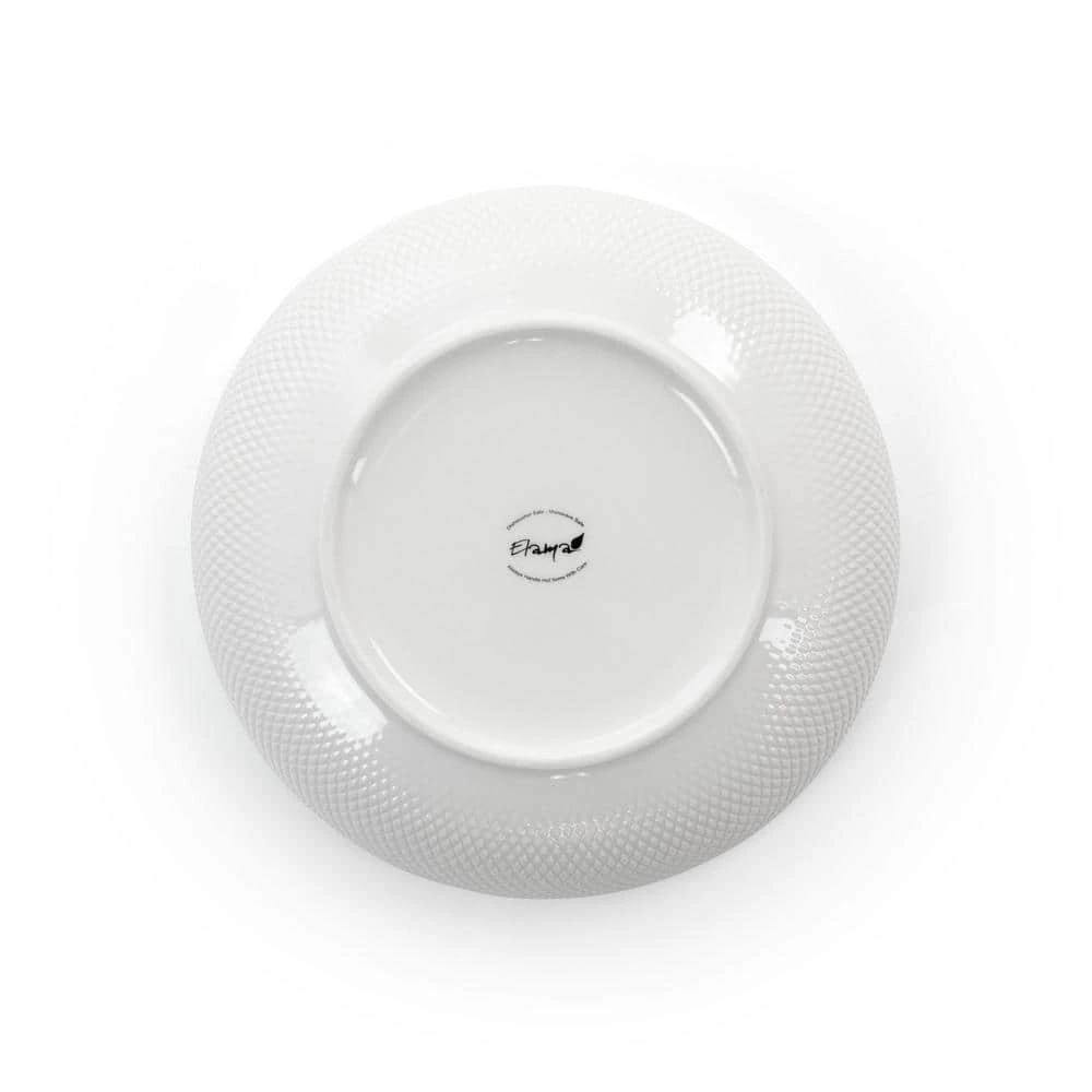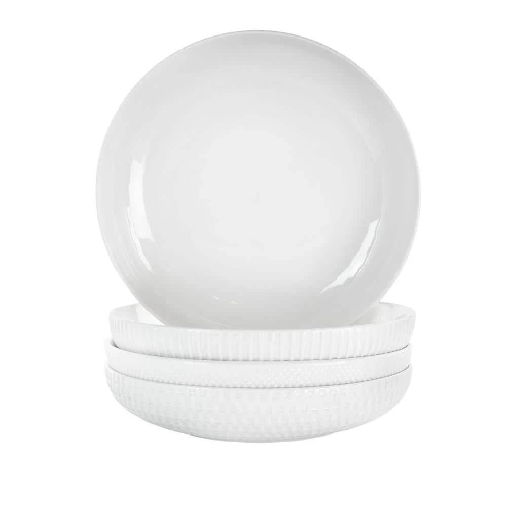 Take the center stage at the next potluck with the Elama Esme 4 -piece Porcelain Assorted Bowl Set in White. Each bowl features one of four embossed designs, ranging from weaves and diamonds to deep vertical grooves. The 9 in. diameter allows for family sized portions of meals. The Porcelain makes maintains heat for long parties and day long gatherings. This set is durable enough to be cleaned in dishwashers and is microwave safe for reheating leftovers. Serve slow cooked pork, fresh fruit, salads, cookies any other desired treats.