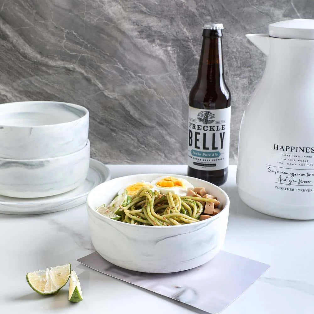 - Trendy design – gray swirls over white porcelain, the modern, wavy-shaped plates, bowls and mugs have an artsy feel, goes well with casual or formal dining, matches beautifully with your favorite cutlery and glassware