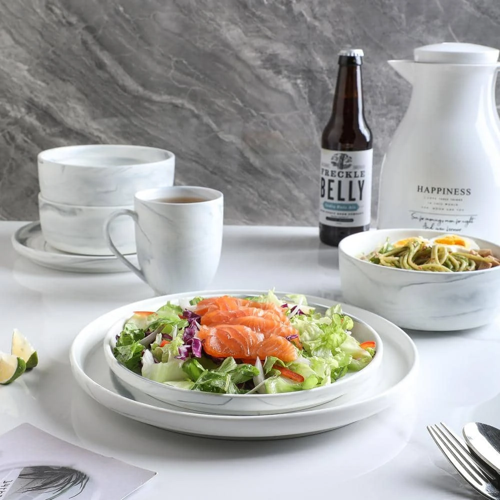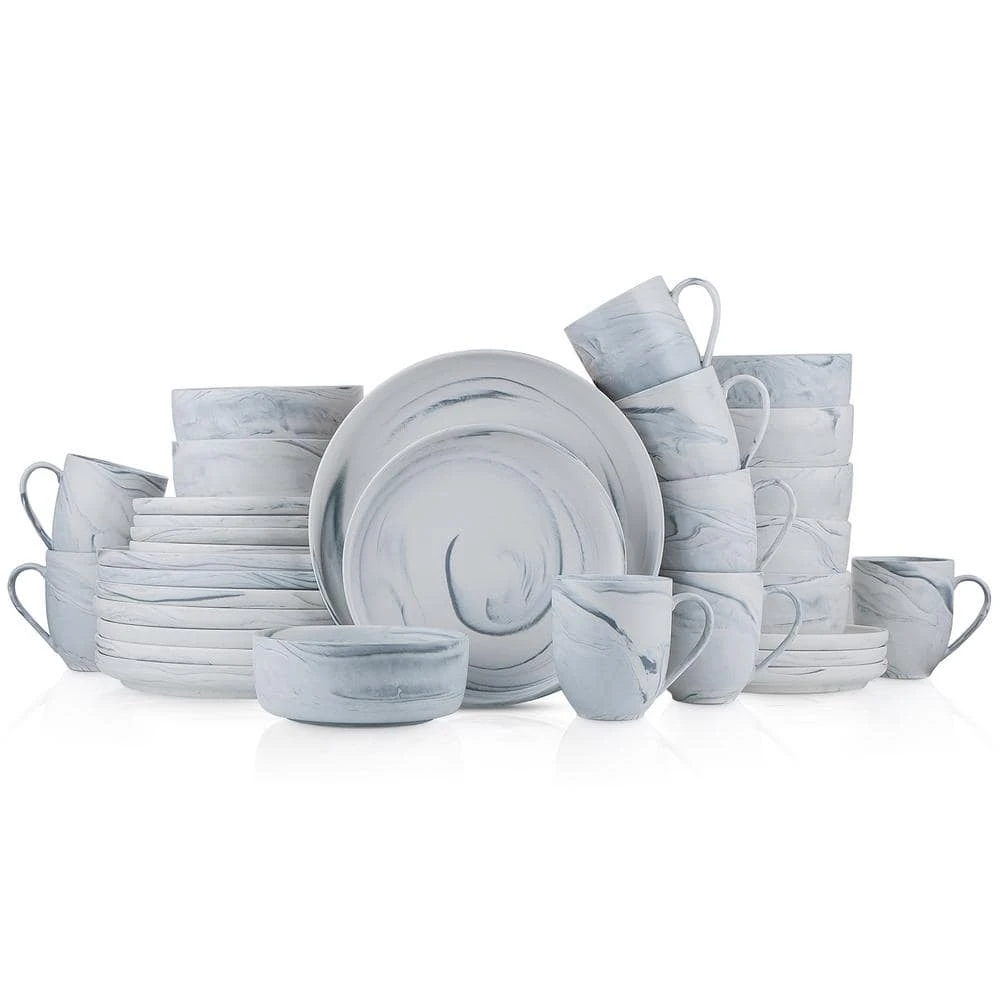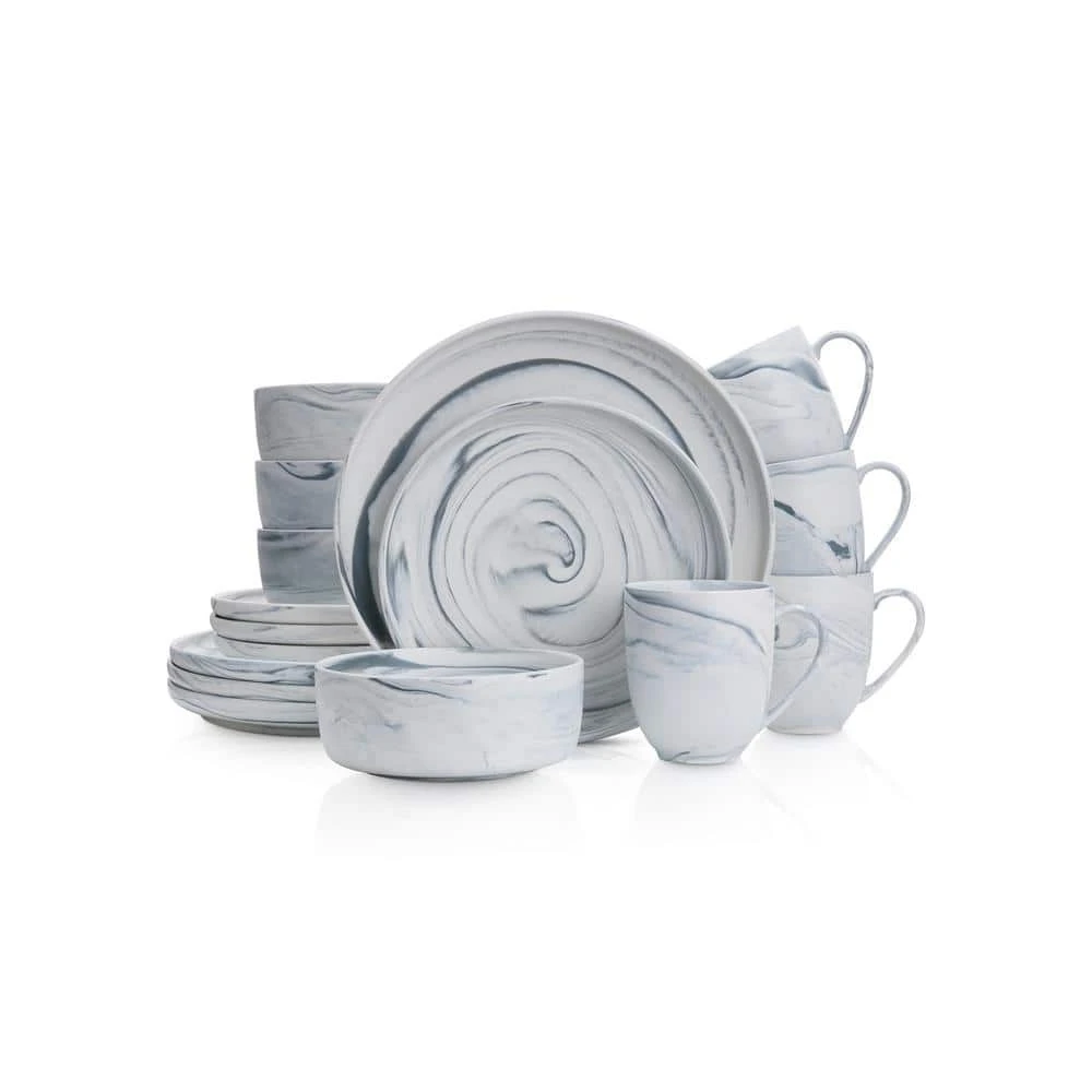 Stone Lain 32 Pieces Porcelain Gray Marble Round Body Dinnerware set includes 8-complete place settings. These hip porcelain tableware settings are accented with gray swirls. It has a modern art, downtown look and feel. Includes 8-large round dinner plates, 8-classy round salad plates, 8-deep round bowls and 8-rounded 12 oz. mugs. These home essentials are expertly crafted and artfully designed. 100% dishwasher and microwave safe for easy cleaning and durability. The hip, trendy design pairs exquisitely with both formal and casual cutlery, as well as with your favorite glassware and tablecloths. Stone Lain creates unforgettable dinnerware to make every occasion memorable. Thank you for choosing Stone Lain, where dishes come true.