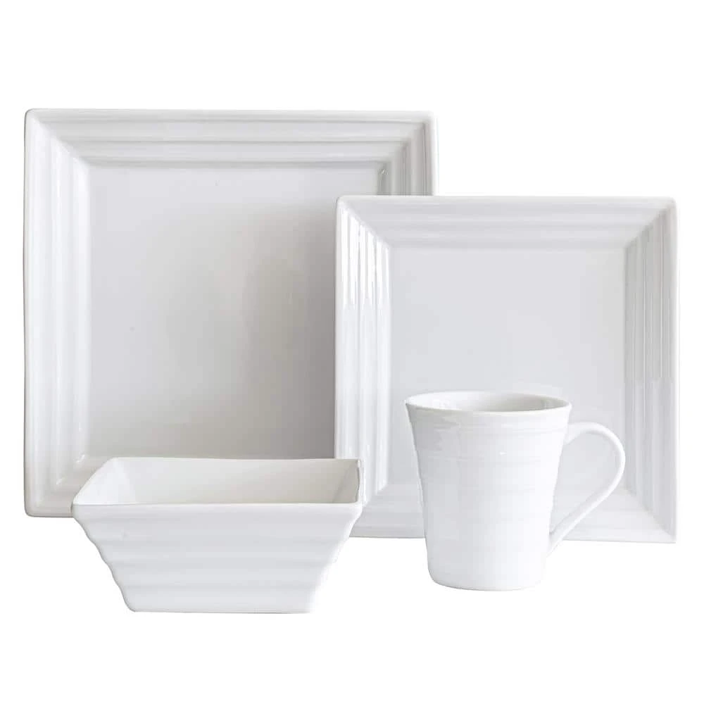 A bold square profile makes for the percet dinnerware set for everyday and formal affairs alike. Set includes: 8 dinner plates (10.75 in. x 10.75 in. x 1.38 in.) , 8 salad plates (8.66 in. x 8.66 in. x 1.18 in.), 8 bowls (6.3 in. x 6.3 in. x 2.68 in.) and 8 mugs (5.24 in. x 3.86 in. x 4.29 in.). Service for 8. Made of Porcelain.