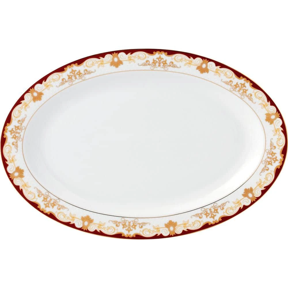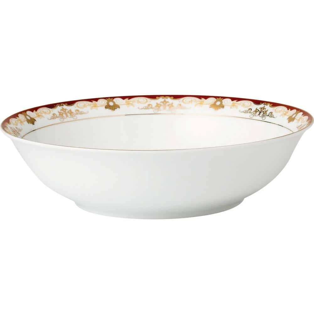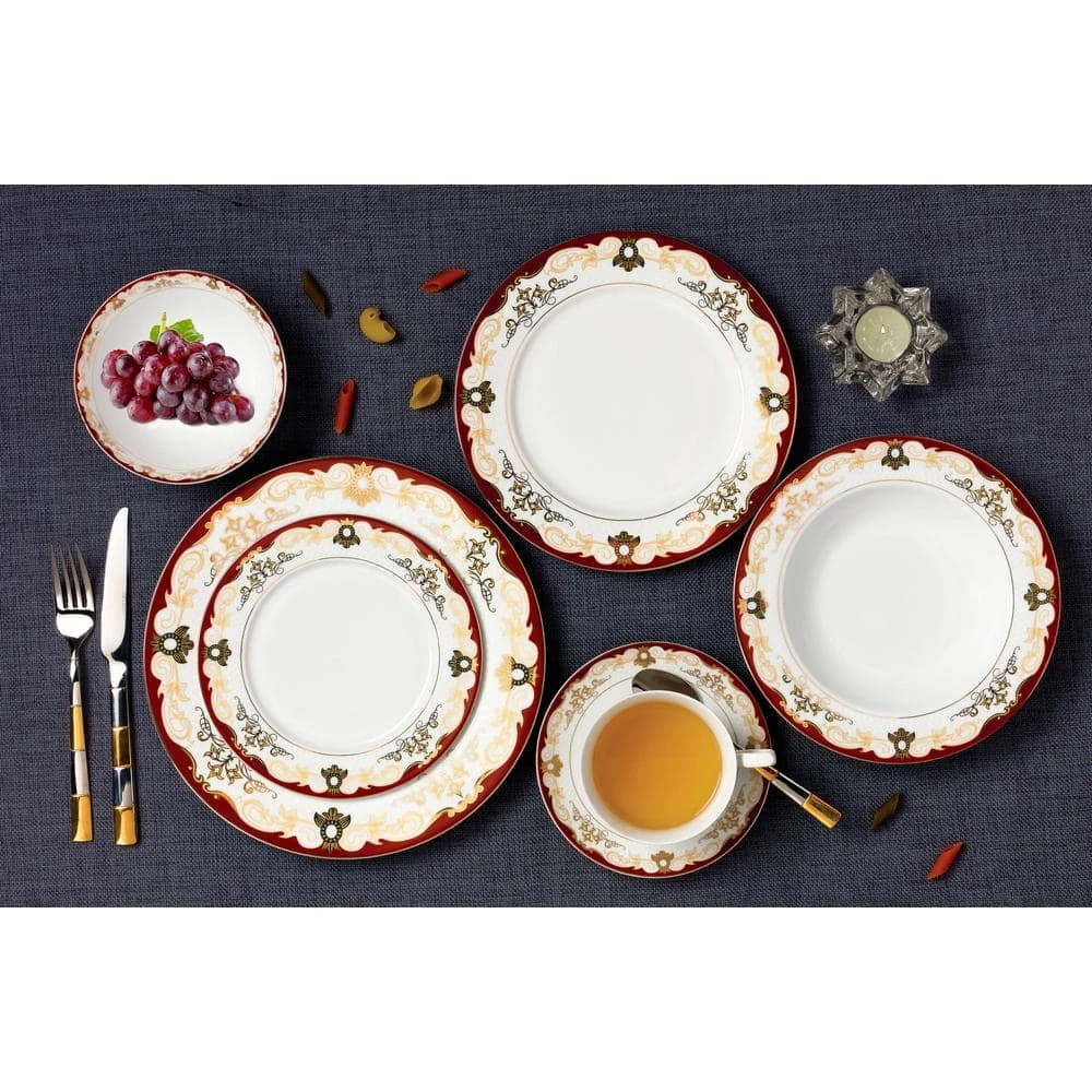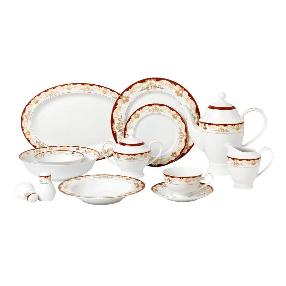 This elegant bone china set has durable quality with a delicate and exquisute look. The Mabel pattern from the La Luna Collection by Lorren Home Trends is a fun a artistic pattern featuring an elegant gold scroll design surrounded by a burgundy border on lightweight translucent bone china. A complete service to easily entertain 8 people. Set Includes: 8 in. to 10.5 in. Dinner Plates, 8 in. to 8.5 in. Soup Bowl (holds 8 oz.), 8 in. to 7.5 in. Salad/bread and butter dishes, 8 oz. to 8 oz. Cups 5 in. x 4 in. x 2.25 in., 8-Saucers, 8 in. to 5.5 in. Fruit or Dessert bowls, 1 in. to 14 in. Oval Platter, 1 in. to 9 in. Serving Bowl, 1-Salt and Pepper set 4 in., 1-Teapot with lid holds 48 oz. and measures 10.5 in. x 5 in. x 9 in., 1-Creamer 5 in. x 3 in. x 4.5 in., and 1-Sugar Bowl with lid 7 in. x 4 in. x 5 in. Hand wash recommended. Oven safe to 350°.