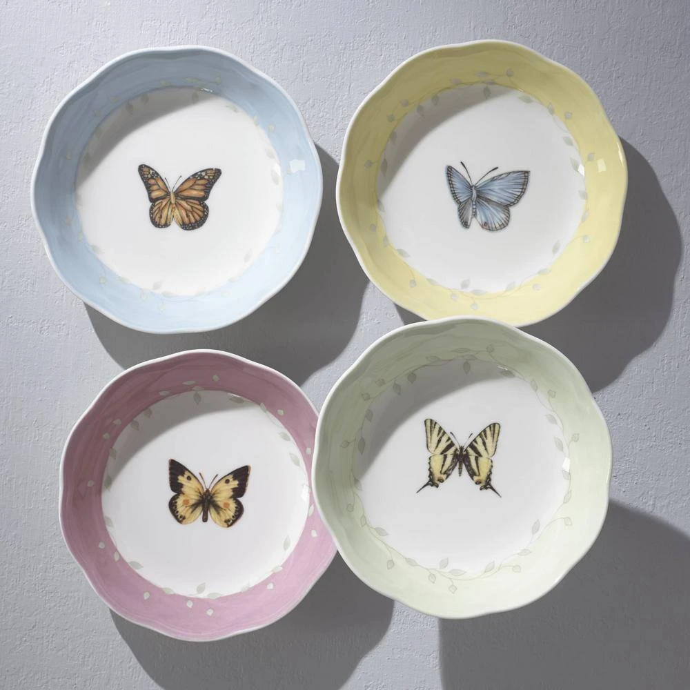 The classic Butterfly Meadow design decorates and shapes this durable white ceramic porcelain 4-piece fruit dish set with a gently scalloped rim and lively garden illustration. These dishwasher and microwave-safe bowls make a charming addition to any table setting. Each fruit dish has a different color inner rim of Pastels: Yellow, Mint, Blue and Pink.