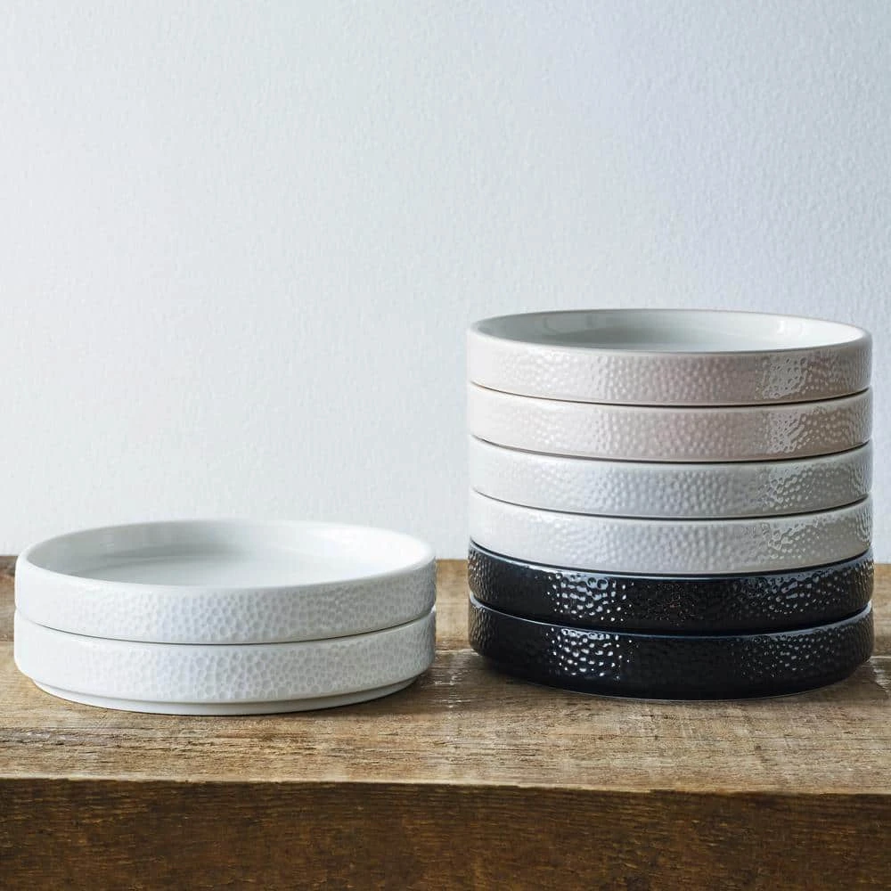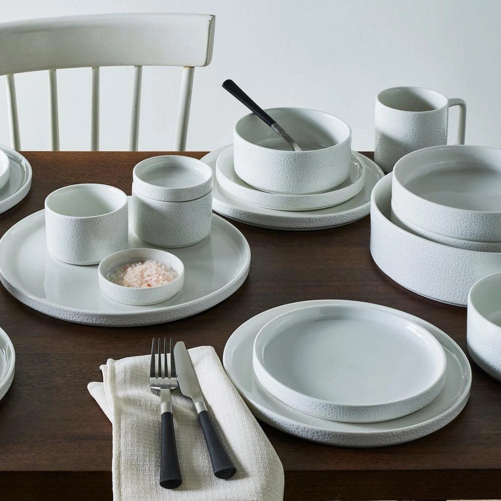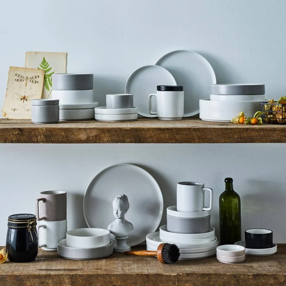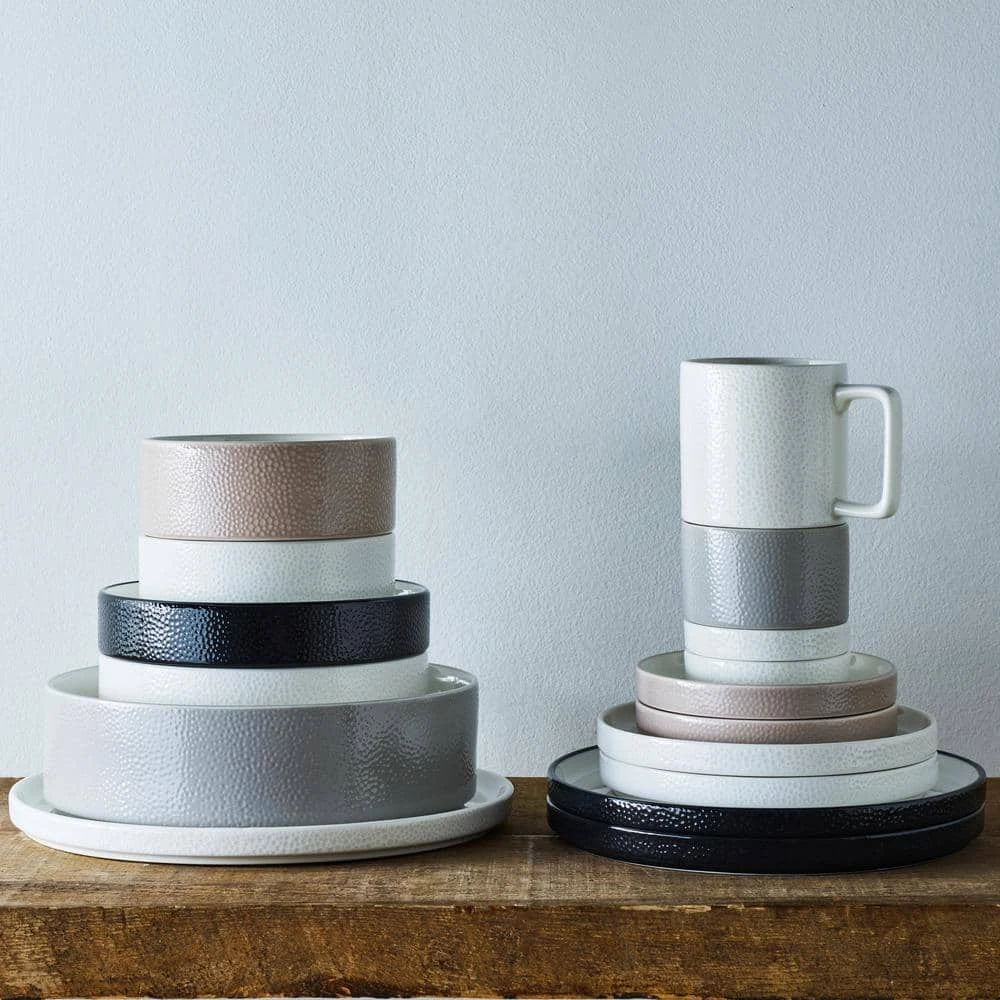 The Colortex Collection is a distinctly modern grouping of dinnerware. It is available in four exterior colors (Black, Grey, Taupe, White), showcasing a glossy pebble texture against a bright-white glazed interior. The range of colors and items available provide an array of options for the table.