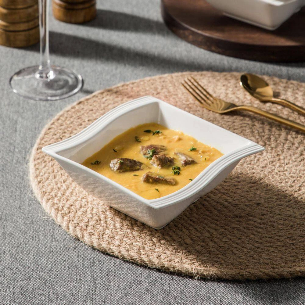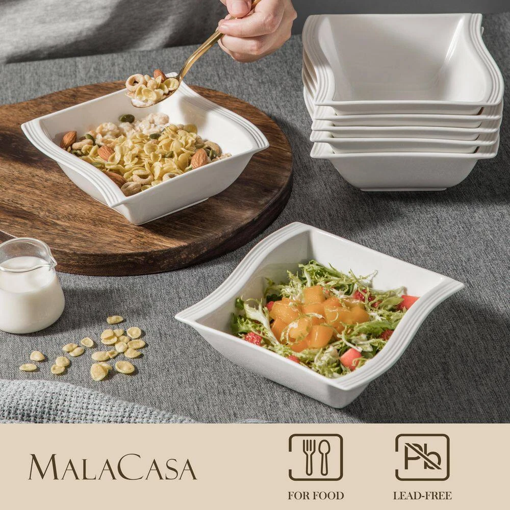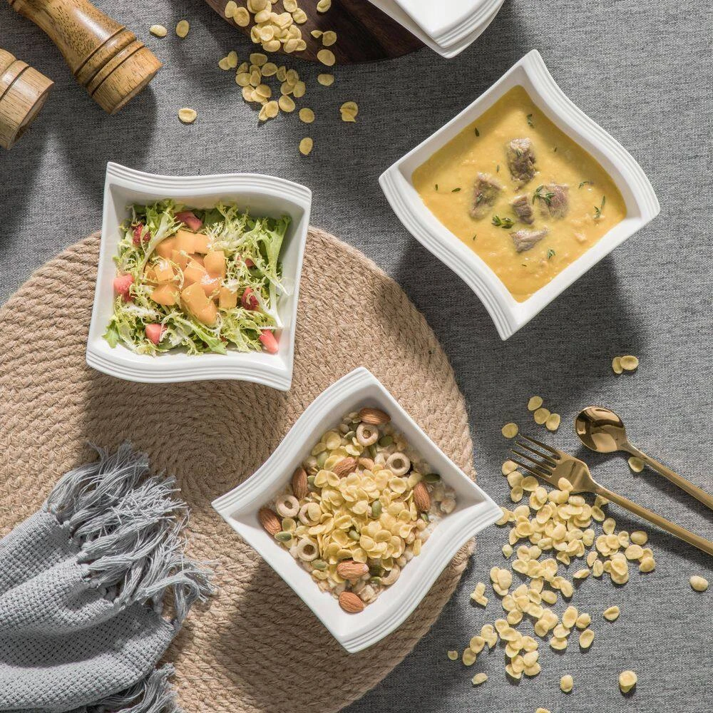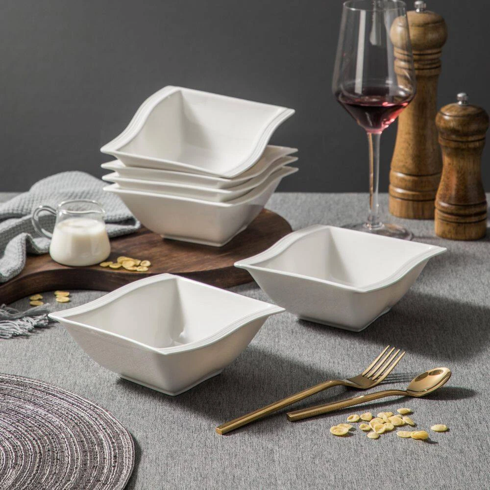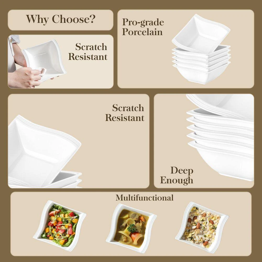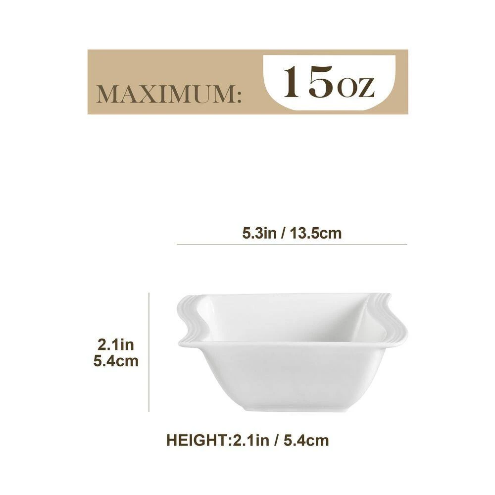 Exquisite white square bowls add advanced sense and bring you fabulous experience for meal. Lead-free and toxic-free porcelain dinnerware set contains 6pcs 15 oz cereal bowls. Porcelain bowls set fit for most food in daily life. Adopted with high-temperature tech in process of production, safe in oven, freezer, dishwasher and microwave.