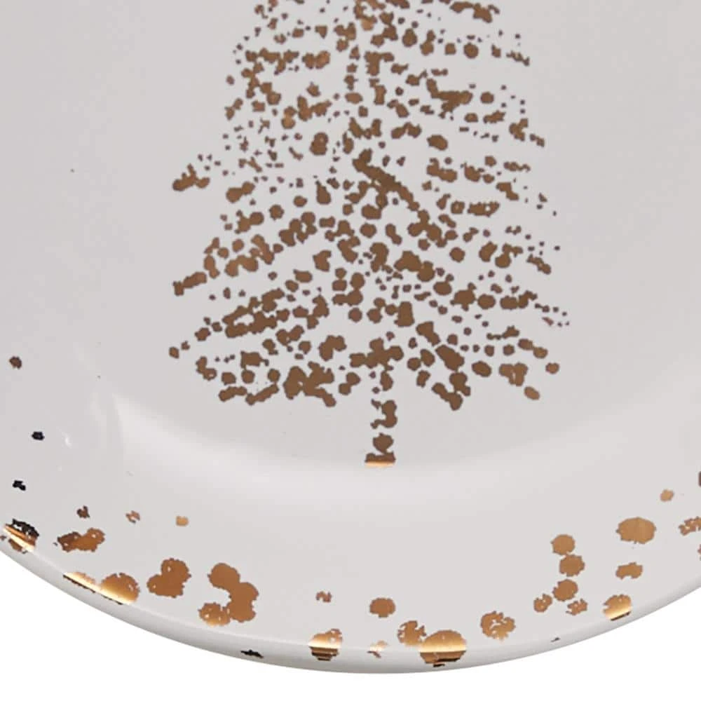 This beautiful set of four appetizer plates are a perfect combination of simplicity and efficiency. The round shaped plates are perfect for entertaining during the holiday season and the neutral color works well with most home decor trends. This classic design features a cheerful group of sparkling fir trees that add a little magic to your table setting.