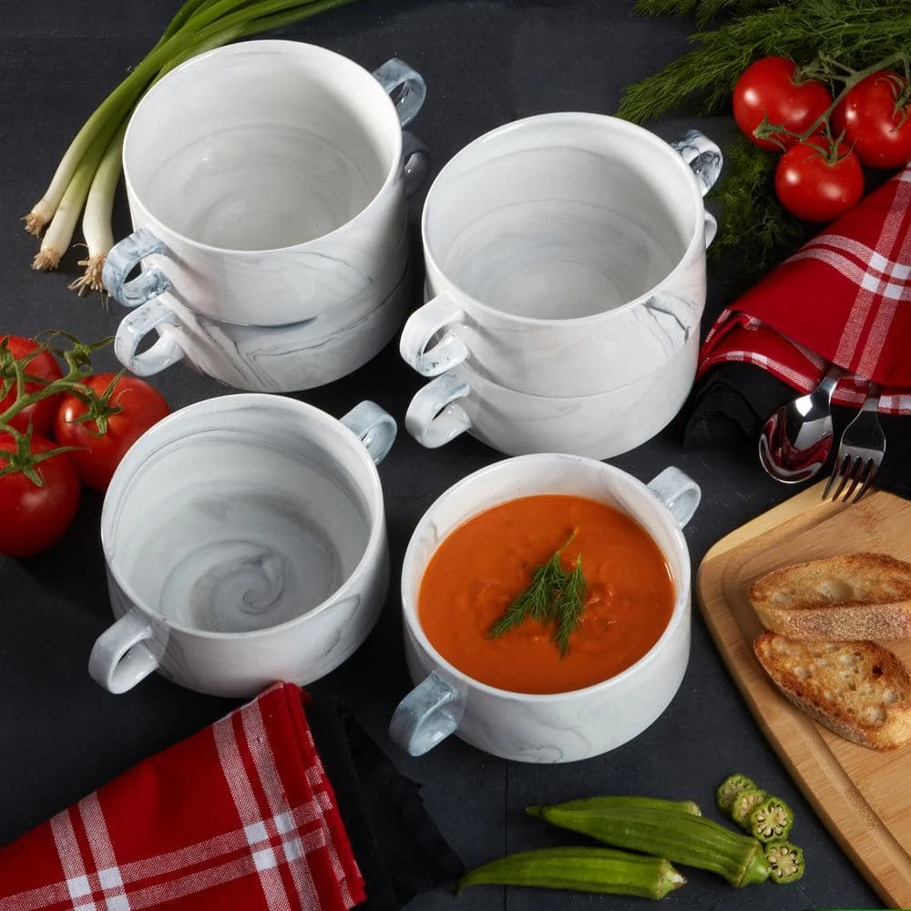 Enjoy your favorite soup in this Set of 6 soup crocks by Certified International . Decorated with a classic marble design ,with handles on each side , they are elegant yet practical and coordinate with any dcor. This set of 6 can be used for individual servings of many other dishes because of its generous size 7.5 X 5.35 X 3.25 . Dishwasher, microwave and oven safe.