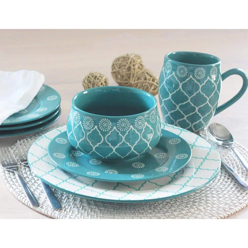 - 16-piece set includes: four 11 in. dinner plates, four 8 in. salad plates, four 5 in. bowls and four 19.5 oz. mugs