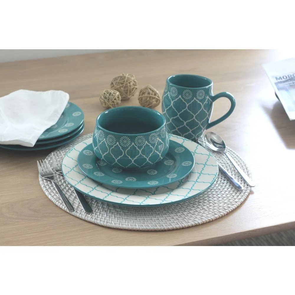 Inspired by tile work from Morocco. This set features mixed patterns that layer beautifully on any table to give any meal that global feel. Set includes 4 each- Dinner Plate, Salad Plate, Bowls and Mugs.