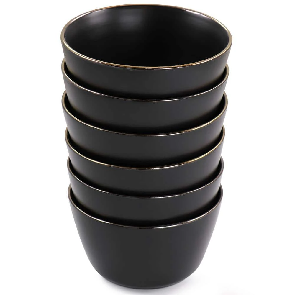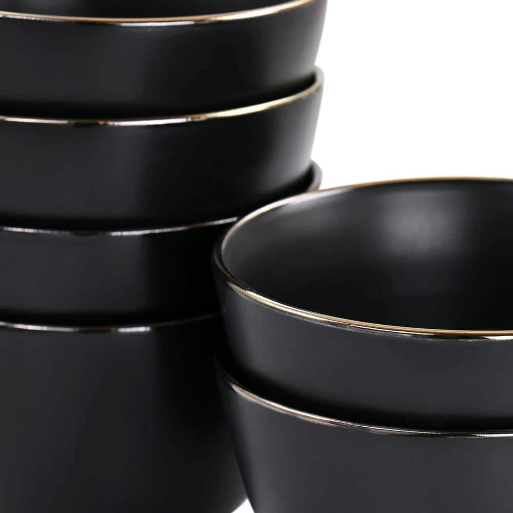 Add a beautiful accent to your dining table with the Arthur 6 Piece Bowl Set in sophisticated Matte Black with Gold Rim Trim. Each piece is creatively crafted with a unique flat base and trimmed in gold. Beautifully finished off with a thin elegant gold rim, this set is a statement piece. Constructed of Stoneware, these bowls are ideal for special occasion gatherings and sturdy for every day use. Each bowl is microwave safe for quick reheating and dishwasher safe for easy cleaning. Mix an match with new pieces and pieces you’ve collected over the years.