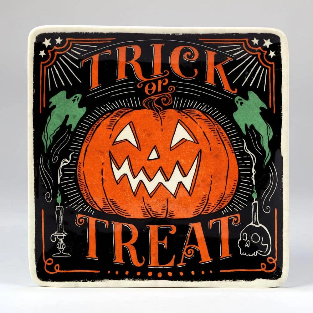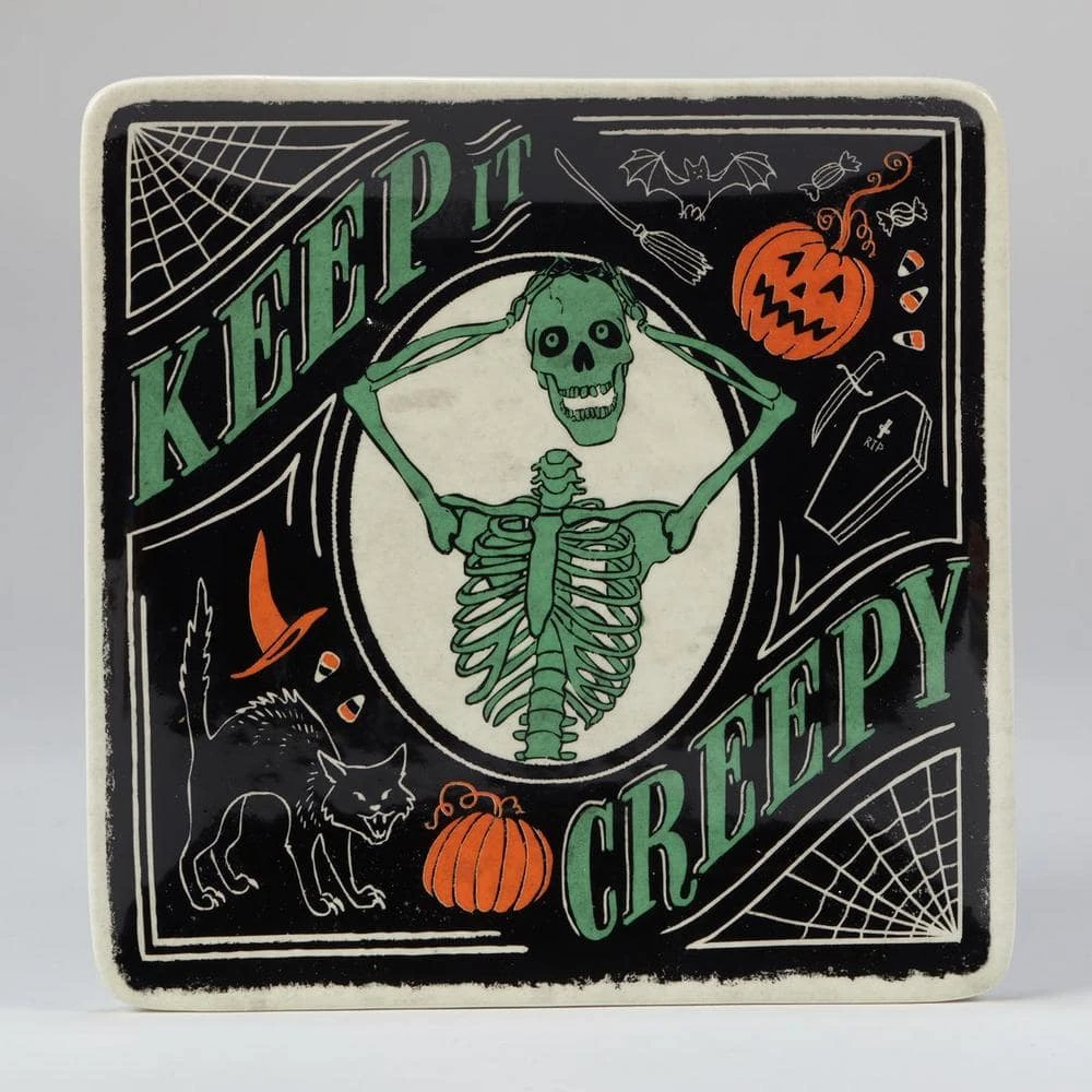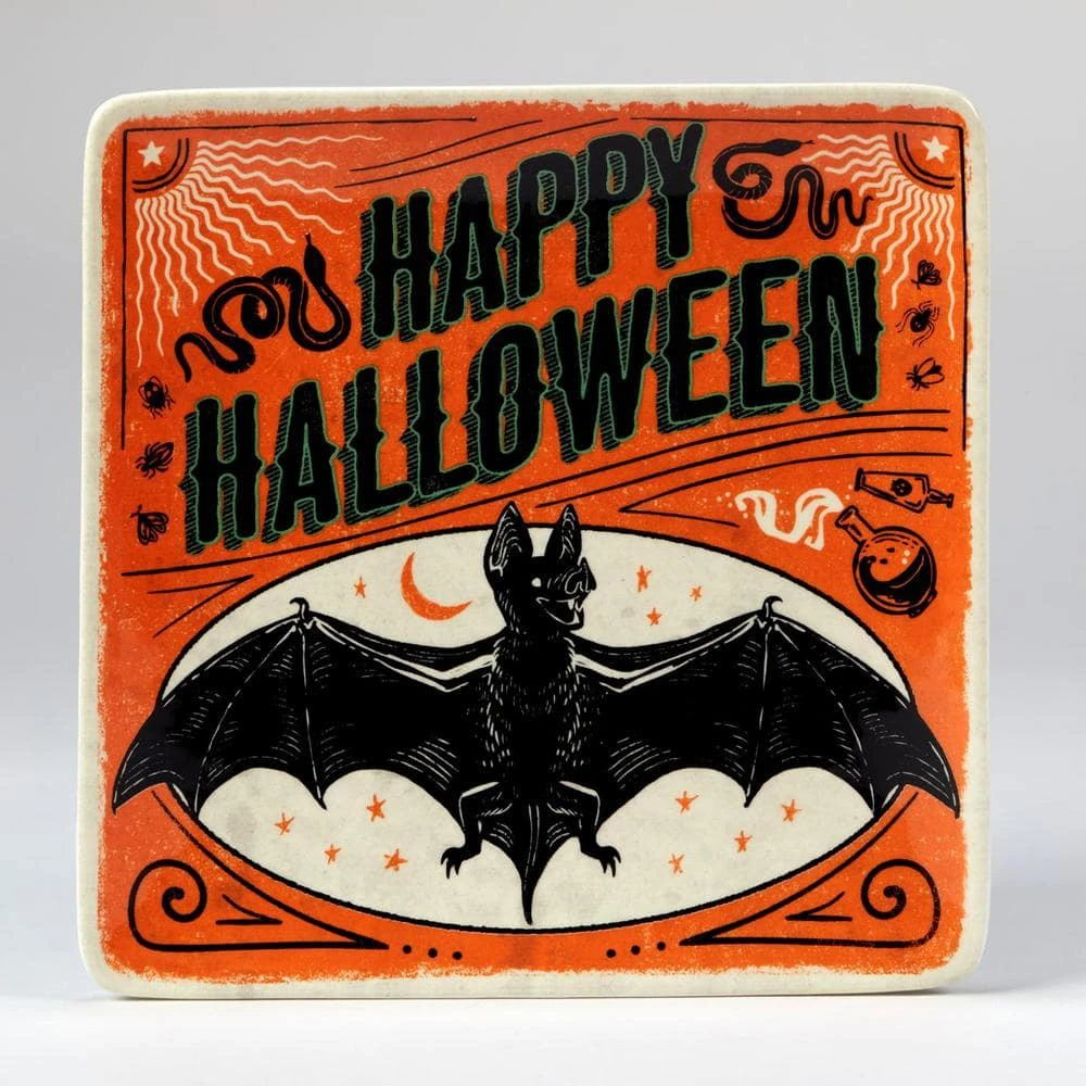 Celebrate Halloween with these spooky themed “Scaredy Cat” Set of 4 Dessert Plates from Certified International, designed by the artist Janelle Penner. These colorful ceramic 8.5 in. square plates come in 4 assorted designs featuring bats, skeletons, pumpkins and black cats, perfect for entertaining your family and friends on this scary holiday. Be sure to get the matching ceramic mugs, canapes and coordinating serveware, as well as the fun 3-d items and melamine serveware for all your trick or treaters.