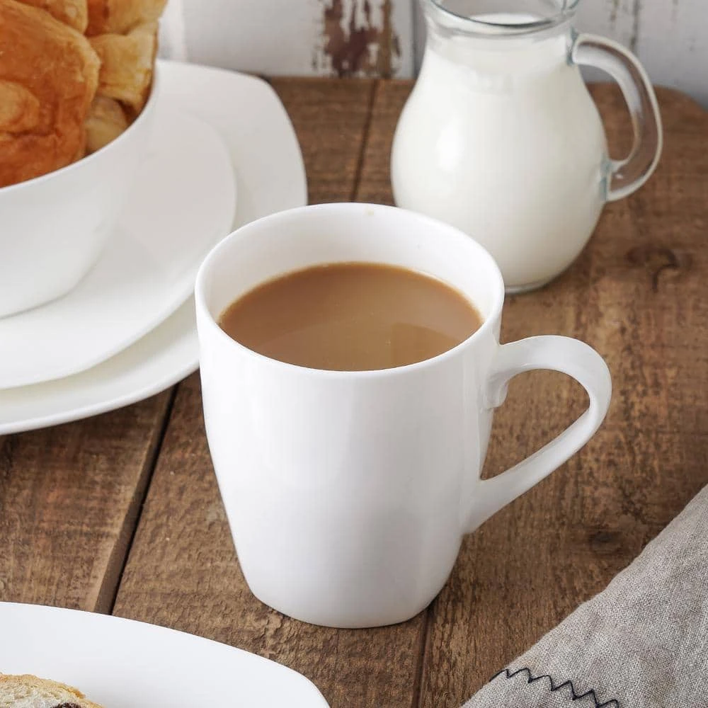 - 32-piece dinnerware set- bone china sets with curved edges, includes square dinner plates, salad plates, bowls and handled mugs