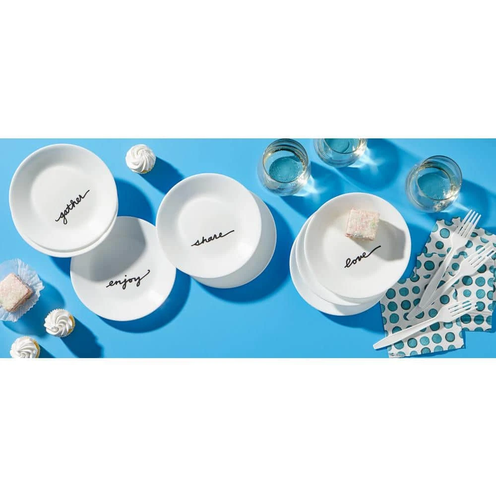Perfect for any occasion, but sure to set a jubilant tone for celebrating with family and friends. Set the tone for your gathering with these charming plates, just meant for celebrating. These snack plates pair beautifully with simple white dinnerware or are perfect on their own for any occasion. Set includes four 6.75″ appetizer plates – two each: Share, Gather, Enjoy and Love.
