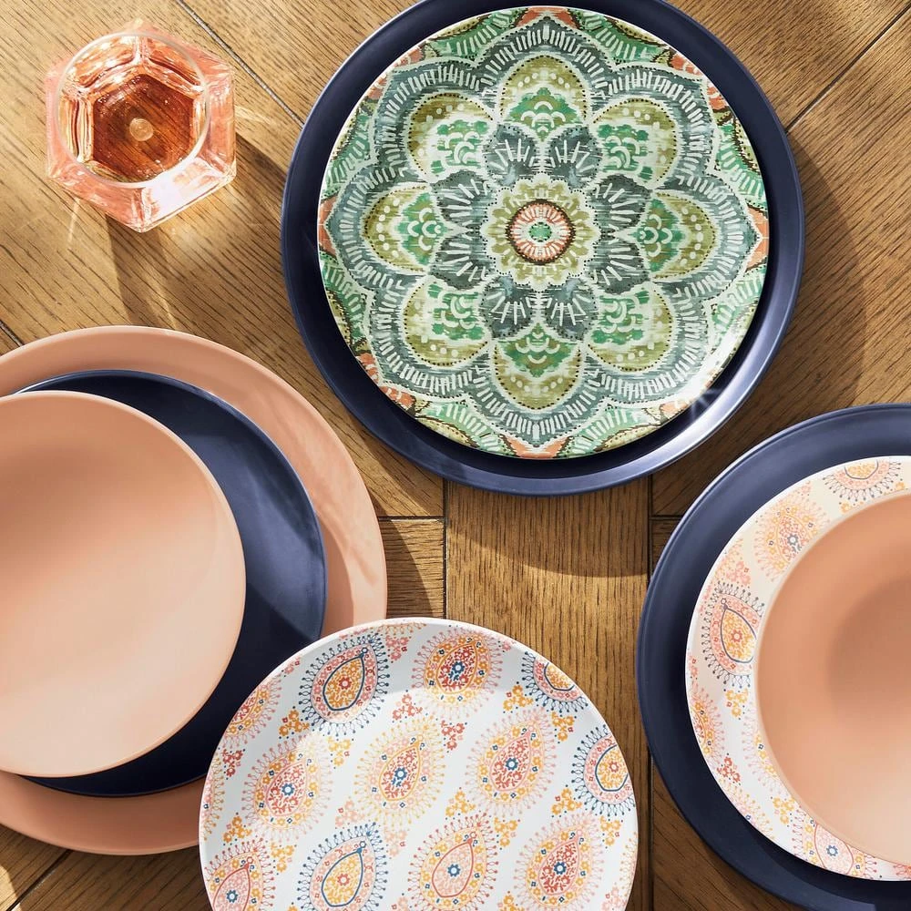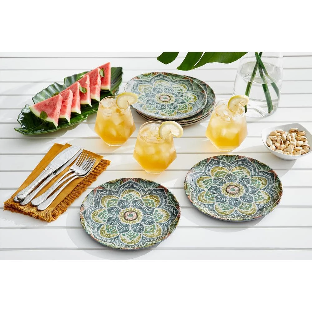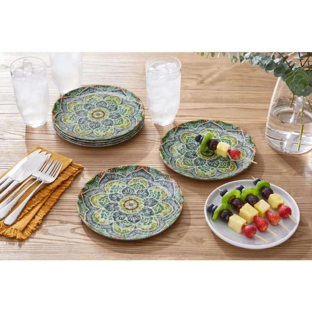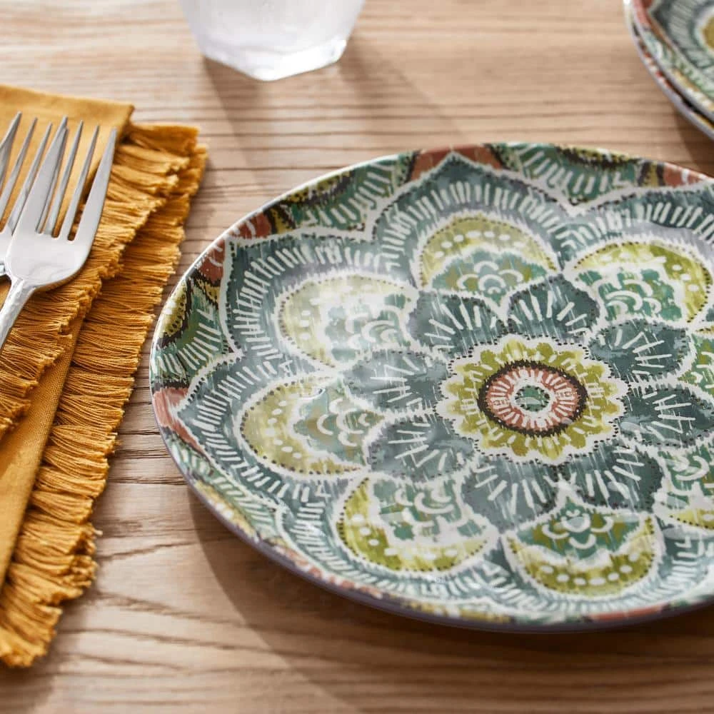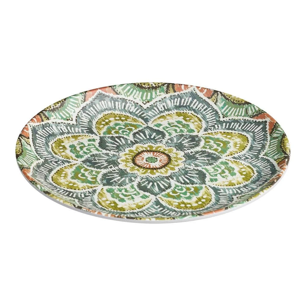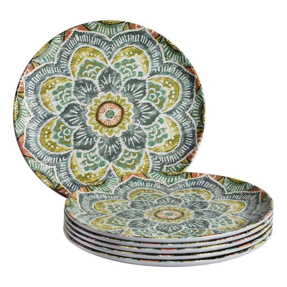 Make a unique style statement at the dinner table with these melamine Jetsetter Medallion Accent Plates from StyleWell’s exclusive Taryn Collection. The plates feature an eclectic medallion design that weaves shades of green, gray and clay together for a striking and artistic statement. With an 8.5 inch diameter, these plates are the perfect size for any salad, appetizer, or dessert and can easily stand alone or be creatively mixed and matched with other items from the Taryn Collection – our stylists love them layered with the Ribbed White Dinner Plates! Durable melamine construction stands up to everyday use and is perfect for indoor or outdoor dining. This 6-piece set is dishwasher-safe on the top rack, making cleanup a breeze and leaving more time to enjoy with friends and family.