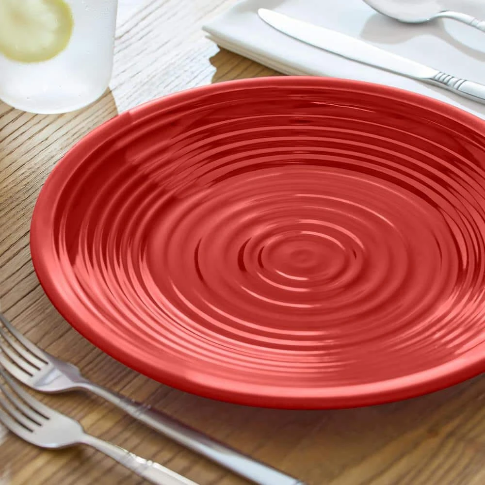 - Set of 6 dinner plates in a glossy, chili red finish with a unique ribbed texture