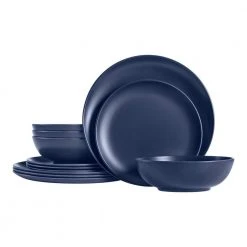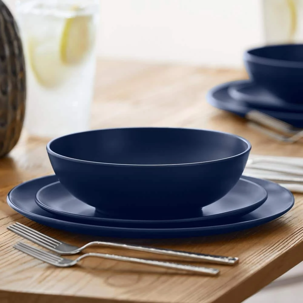 - Round dinnerware set in a matte midnight blue boasts contemporary style