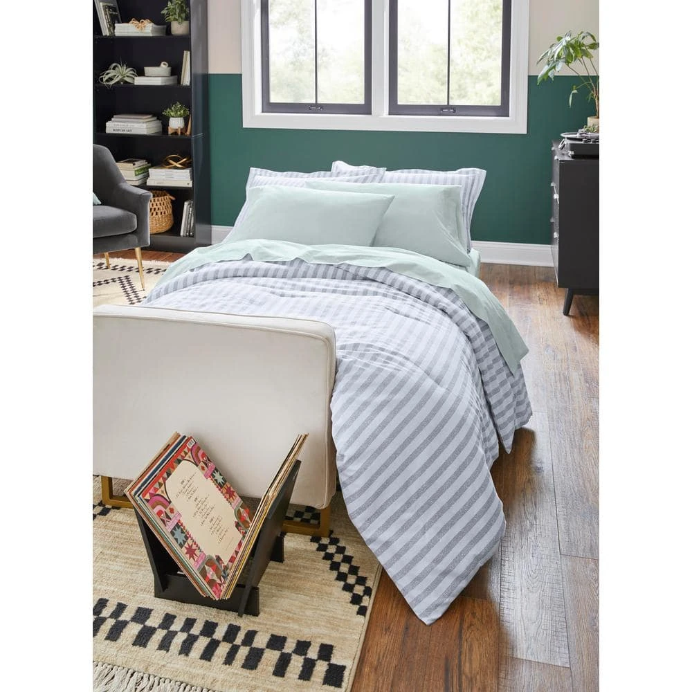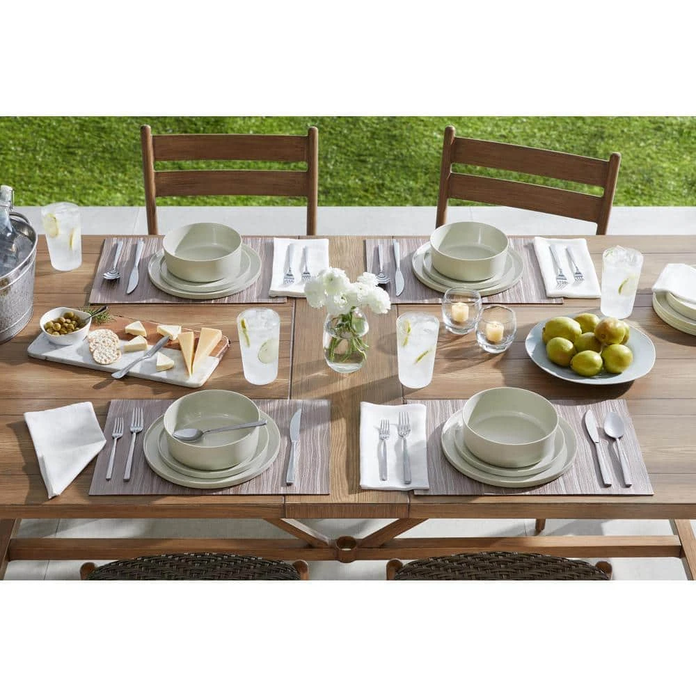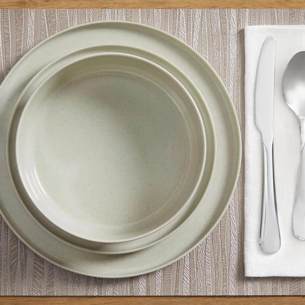 Gather loved ones together for delicious weeknight meals with this 12pc Trenblay Melamine Dinnerware set in Natural Beige from the Home Decorators Collection. A natural beige finish with a soft sage green hue adds a light, modern look to your dining table and each piece boasts a solid pattern and classic round silhouette to complement a range of serving pieces and flatware designs. Pair this set with pieces from the Charcoal Black line of the Trenblay collection for an added modernist contrast. The durable melamine provides strength and resilience for everyday use and the top rack dishwasher-safe design makes cleanup after each meal a simple task.