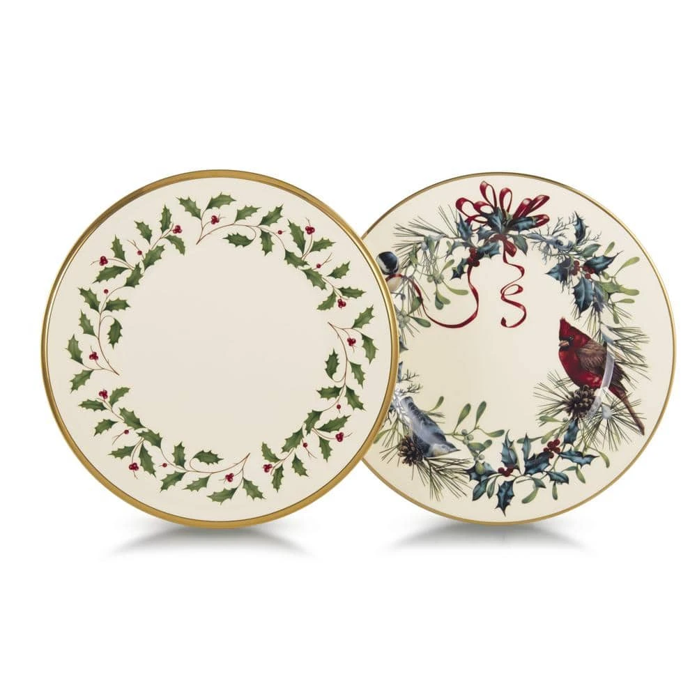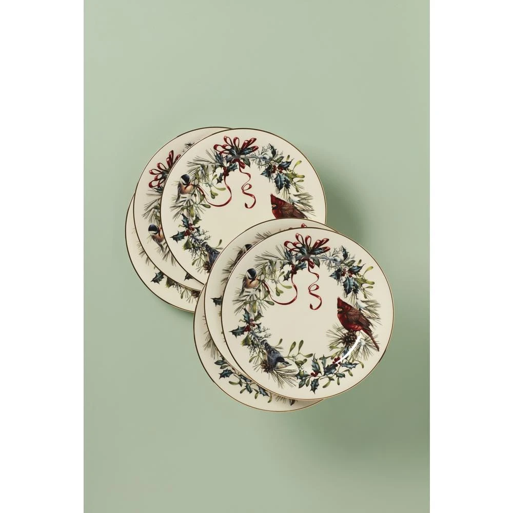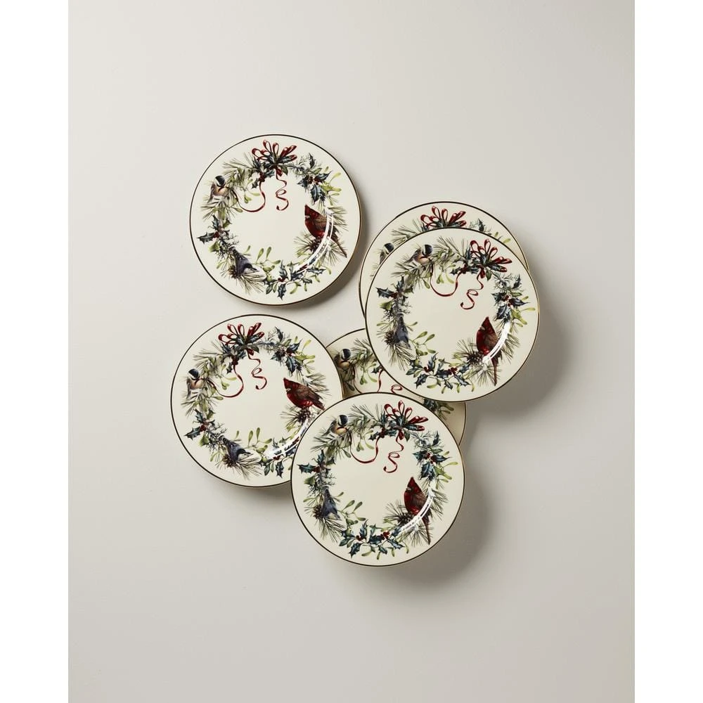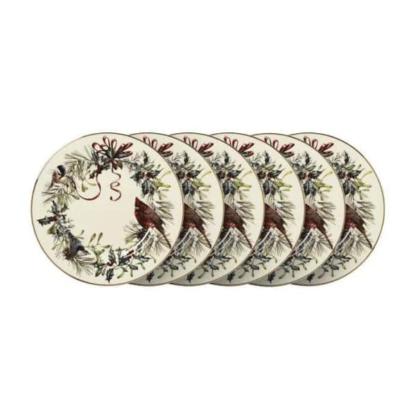 This set of SIX salad plates features charming birds perched in a holiday wreath trimmed with burgundy ribbon. Made of durable ivory bone China. The set includes luminous 24-karat gold accents along the border.